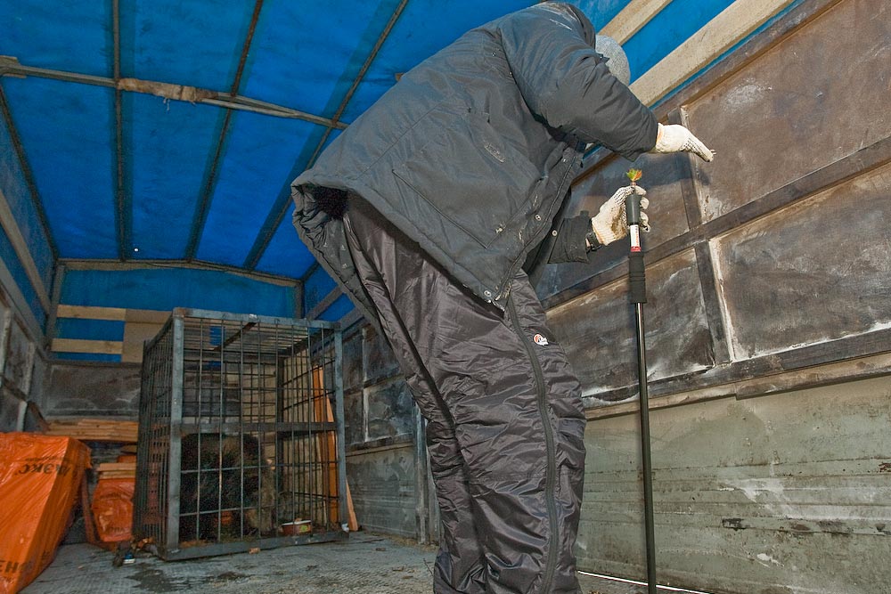 Попасть точно в цель совсем непросто. Я воочию убедился, как тяжело усыпить животное даже в таком выигрышном положении - оно в клетке, человек стоит рядом и целится в него. Сразу вспомнились комментарии ЖЖшных знатоков-всего-на-свете, в которых они рассуждали о том, как легко можно усыпить медведя или лося, забредшего в город. Дескать, выстрелил и готово. Сегодня опытный зоотехник, работающий с животными не первый год, с одного метра смог попасть туда, куда нужно, только со второго раза. В первый раз погнулась игла у шприца и только вторая попытка оказалась успешной.