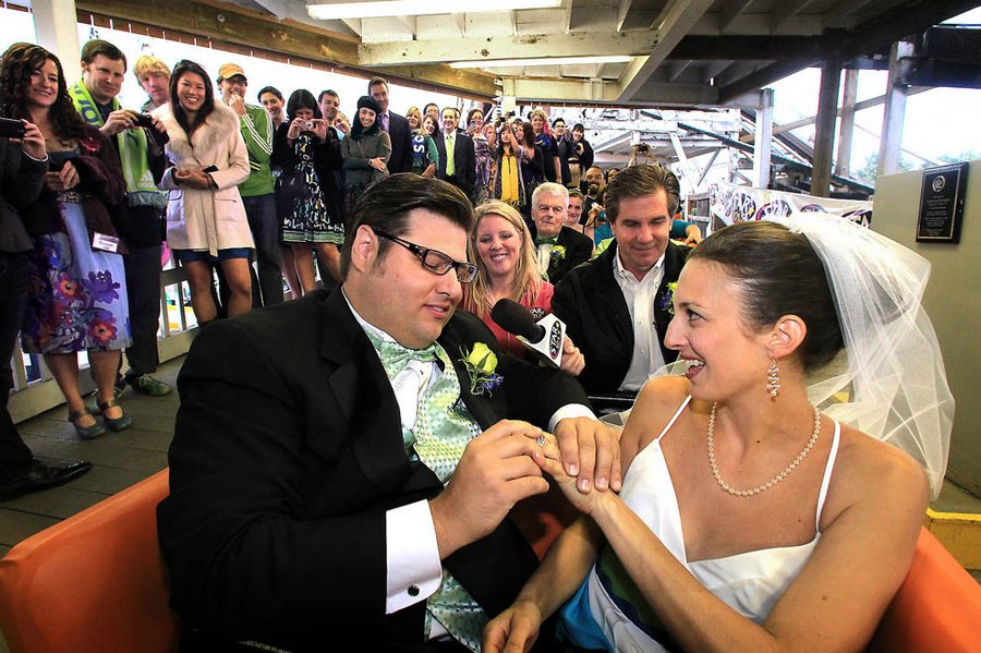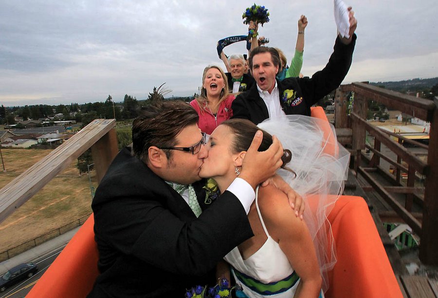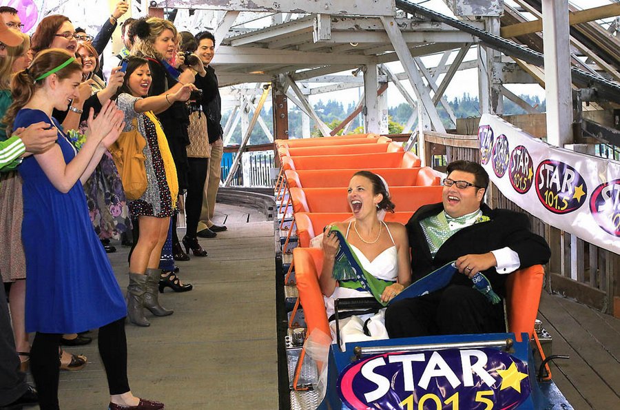 33-летняя невеста Сара Петти из Сиэтла и жених Роберт Шерцер махнулись кольцами. Невеста сказала "Согласна", жених поцеловал невесту и пара покатилась с горок.