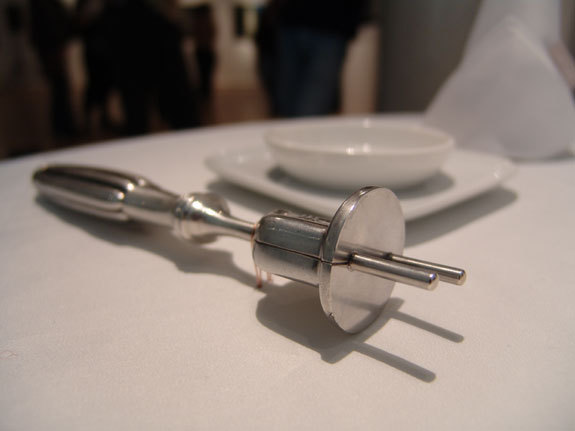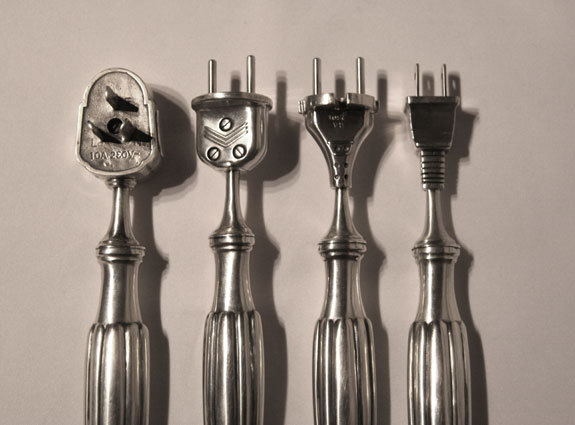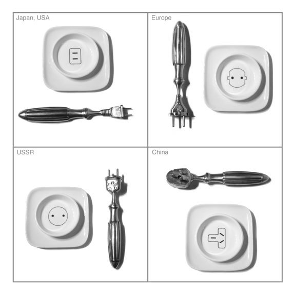 Для создания всего лишь одного скромного произведения искусства потребовалось: килограмм серебра, десять килограммов древесно-стружечной плиты (отформованных в виде стола), семь квадратных метров первосортного дорогущего хлопка (почему-то швейцарского производства - где они там, в Швейцарии, хлопок растят?), четыре недорогие фарфоровые розетки из магазина, четыре (тоже недорогие) квадратные мини-тарелочки из того же магазина, пара перманентных маркеров, рисующих жирным черным цветом, примерно семьдесят килограммов талантливого и дорогого ювелира Толи (в живом и действующем виде), один виртуозный водитель с автомобилем, и некоторое количество денег. Получилось произведение вроде бы искусства под незатейливым названием «Электропитание».