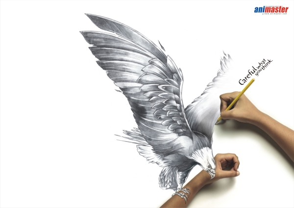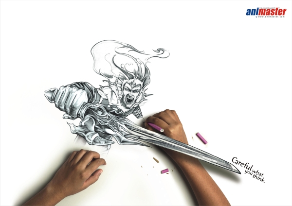 Принты о материальности мысли и мастерстве рисунка для школы анимации Animaster Animation School со слоганом: «Careful what you think». Выполнило рекламу агентство Rediffusion DYR из индийского Бангалор.