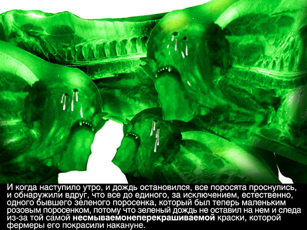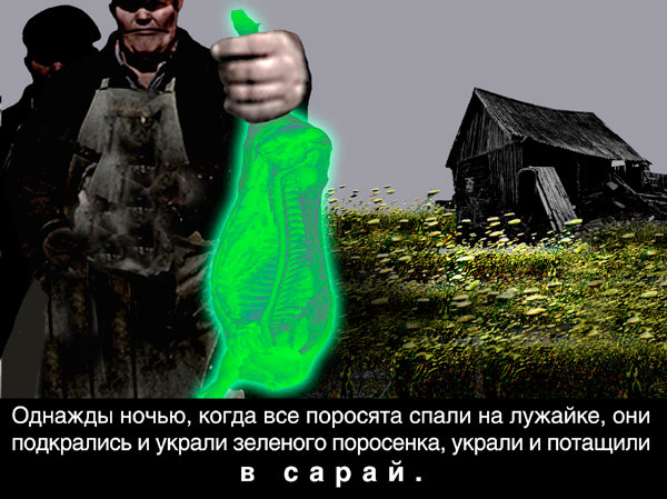 Пьяный поросенок и катапультаПоросенок-мутантПоросенок с человеческим лицомЗеленый мирХитрый поросенокДвуногий поросенокПоросенокПоросенок-мутантЗеленый столЗеленый стол |