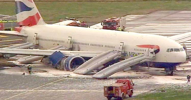 Пассажирский Боинг-777, прибывший в Англию из Пекина, приземлился, не долетев до посадочной полосы. Коснувшись земли, лайнер потерял управление и буквально пропахал длинную борозду на поле, пока не остановился. На борту находились 136 человек, всех их эвакуировали по надувным трапам. Самолeт залили противопожарной пеной, так как была опасность, что загорятся двигатели. Никто не пострадал за исключением троих пассажиров, получивших легкие травмы. Работа крупнейшего в Европе аэропорта из-за инцидента была на время приостановлена. Британскому премьер-министру Гордону Брауну, который собирался лететь в Китай, пришлось ждать несколько часов.