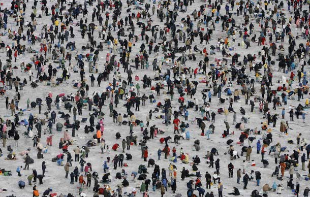 На реке Букханган в южнокорейском уезде Хвачхон состоялась очередная ежегодная подледная рыбалка участников ледового фестиваля «Sancheoneo». Каждый год в середине января сюда приезжает более миллиона человек, чтобы принять участие в этом грандиозном событии - подледной ловле горной форели. Трехнедельный фестиваль не ограничивается одной только рыбалкой, он также включает в себя соревнования по гонкам на санках, лепку ледяных фигур, футбол на льду и другие семейные развлечения, включая большой фейерверк во время закрытия. Но главным событием, безусловно, является выход на лед десятков тысяч людей с удочками и сачками.