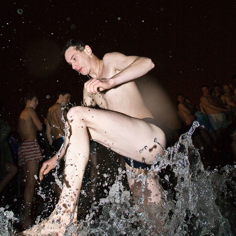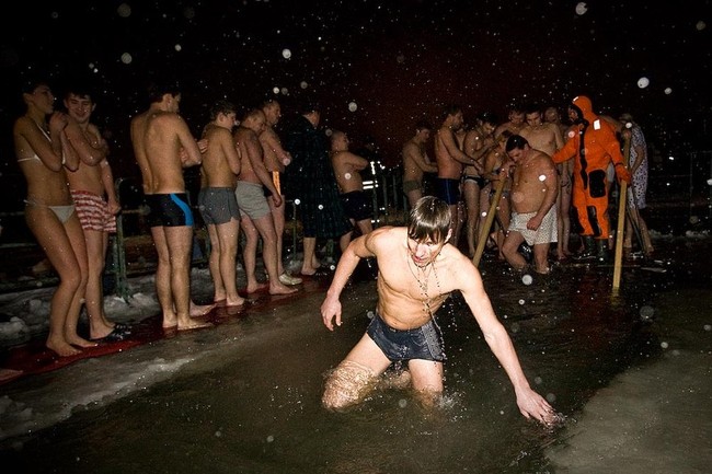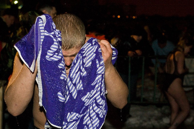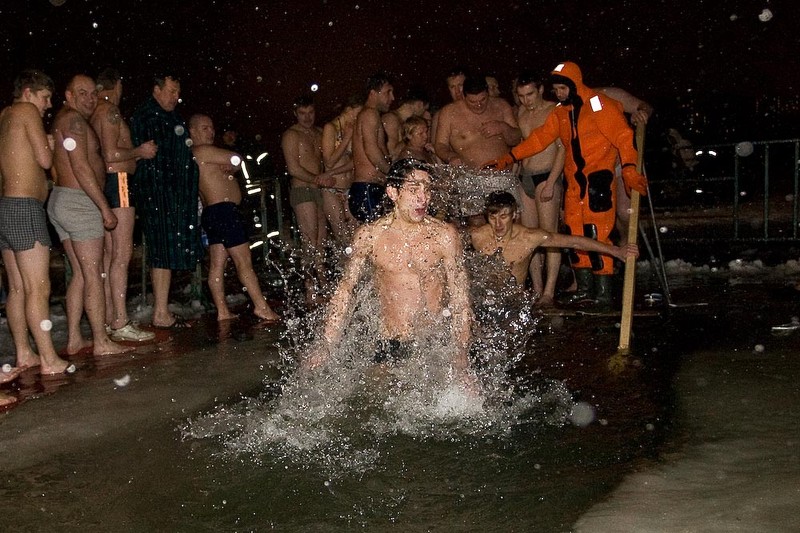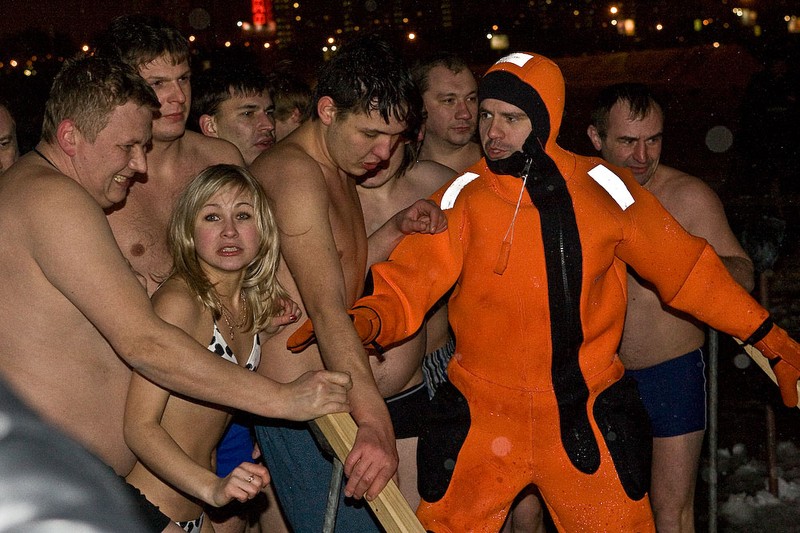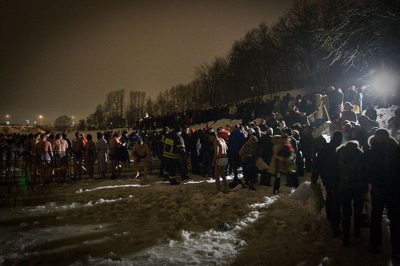 Запланированная поездка в мой любимый Переславль-Залесский, где в Сорока мучеников, по слухам, обещали поставить нормальный свет, по техническим причинам сорвалась и я не нашел ничего лучшего, как в полночь поехать на Борисовские пруды. А там была, как теперь говорят, жесть как она есть. Толпа народа на берегу, одинокая лампа светит куда-то вдаль, но не на купель, МЧСники безуспешно пытаются согнать раздевающихся на снегу людей со льда («Cейчас ведь все провалитесь!»), у изгороди длинная очередь полуголых, а те, кто не хочет стоять в очереди, лезет через железные рамки, огораживающие место купания. Одним словом, по накалу страстей мне это напомнило финальную сцену фильма "День Нептуна". Впрочем, испанцы, вон, через костер на лошадях сигают, а чем мы хуже? В общем, простоял больше часа по колено в воде, снимал практически вслепую со вспышкой, промок насквозь и замерз, поэтому, когда приехал домой, принял сто грамм, чтобы не заболеть ну и за праздник, само собой.